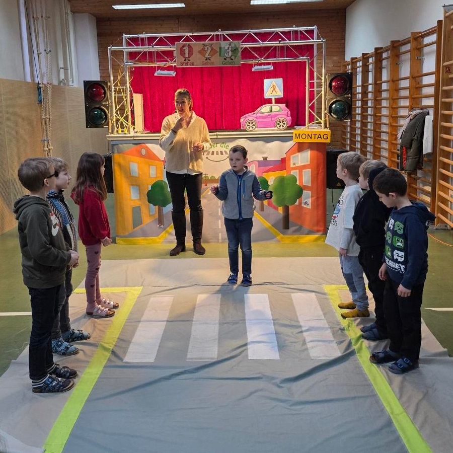 Die Kinder der Klasse 1b durften kürzlich an einem besonderen Workshop teilnehmen: dem Theaterstück „Sicher über die Straße“ der AUVA.